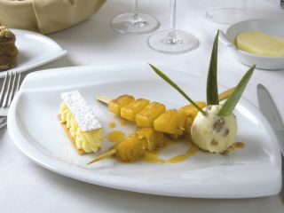Brochette d'ananas rôti, millefeuille de chocolat blanc - coco